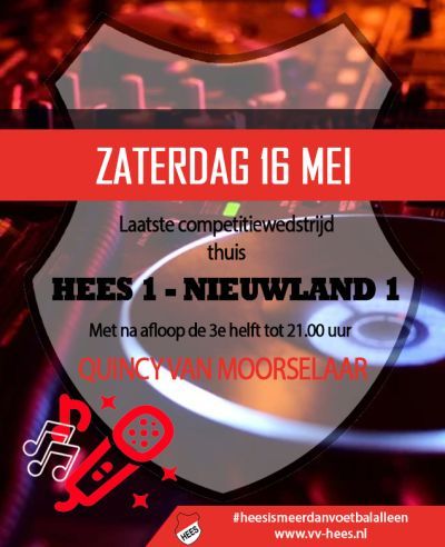 Op vrijdag 16 mei speelt Hees 1 de laatste thuiswedstrijd van het seizoen. Op het Heesveld is Nieuwland ASC 1 de tegenstander. Een goed moment om het seizoen gezamenlijk af te ronden.