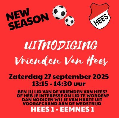 Graag nodigen wij u uit voor de jaarlijkse seizoensaftrap van de Stichting Vrienden van Hees. Deze vindt plaats op zaterdag 27 september 2025 in de bestuurskamer van v.v. Hees, voorafgaand aan de eerste thuiswedstrijd HEES – EEMNES.