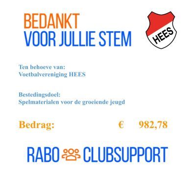 Dankzij jullie steun via de RaboClubSupport actie ontvangt VV HEES dit jaar een prachtig bedrag van € 982,78!