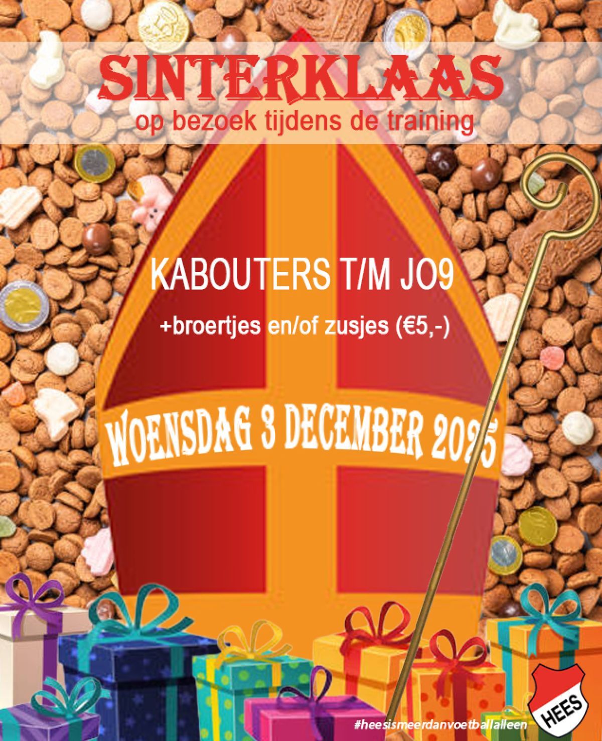 Op woensdag 3 december komt Sinterklaas langs bij vv Hees tijdens de training voor Kabouters t/m JO9. We doen een gezellige training en tijdens de training komt Sint langs om de teams één voor één binnen te roepen voor een cadeautje.