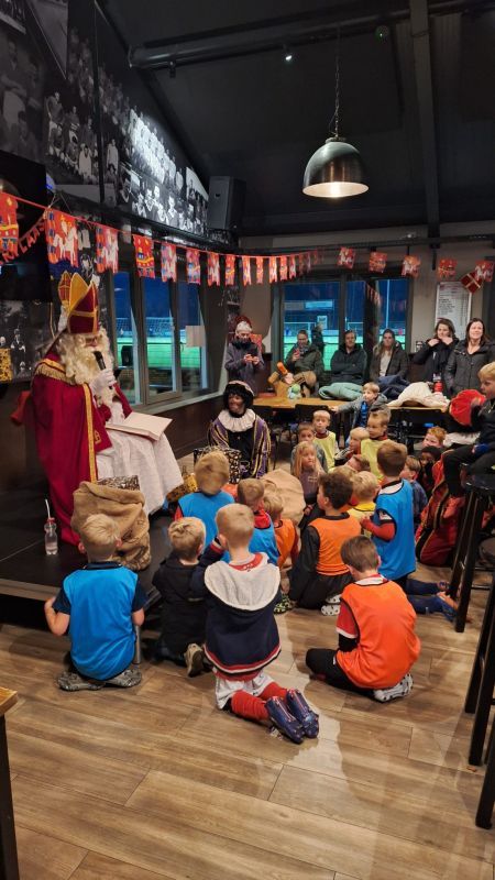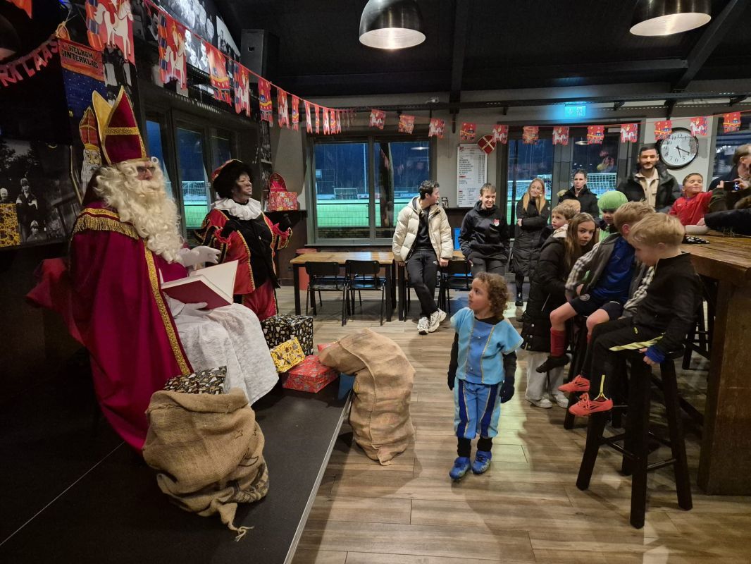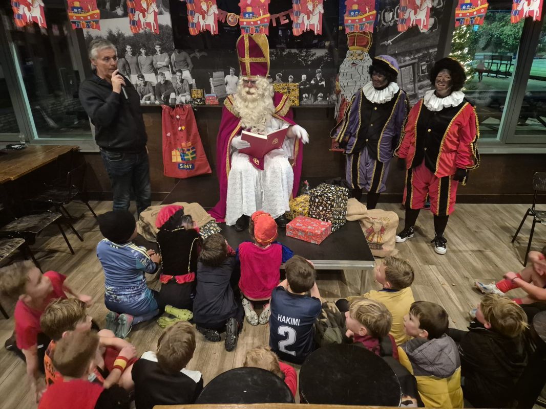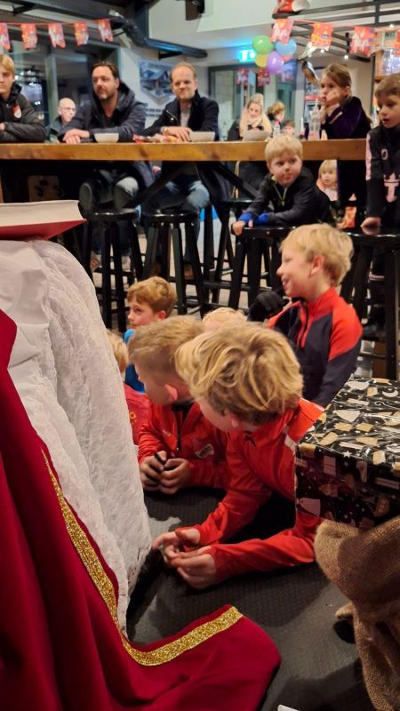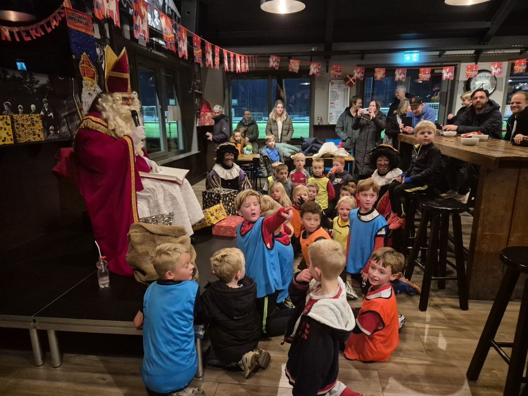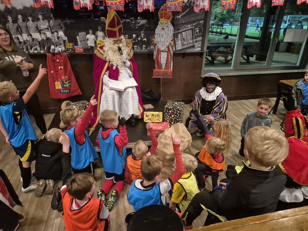 De jongste leden kabouters en JO7 mochten als eerste. Sint wist over ieder kind wel iets te vertellen — en iedereen stak natuurlijk zijn vinger op bij vragen als wie het meest scoort, wie al tanden wisselt en wie een zwemdiploma heeft. Ook kondigde de Sint plechtig aan dat ze echt eens moeten beginnen met échte wedstrijdjes. De kinderen knikten braaf en deden volop mee. De ouders begonnen licht te zweten.