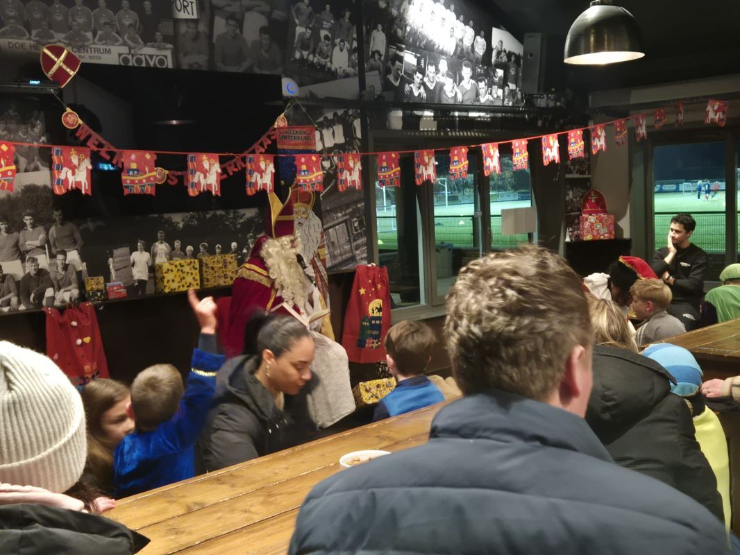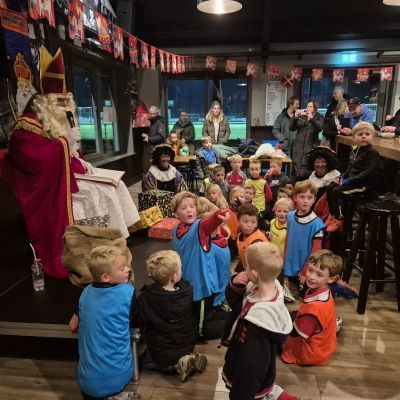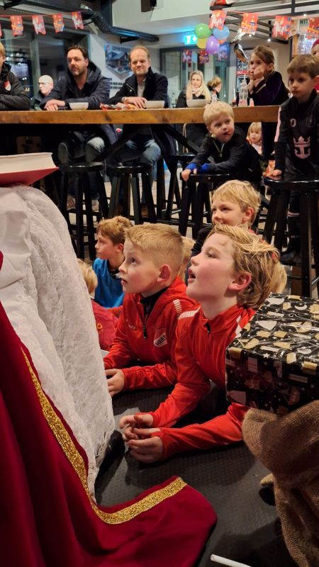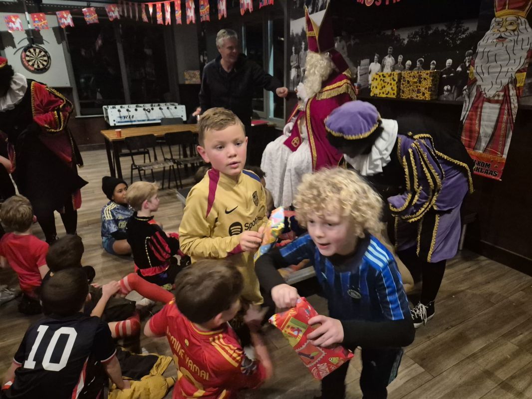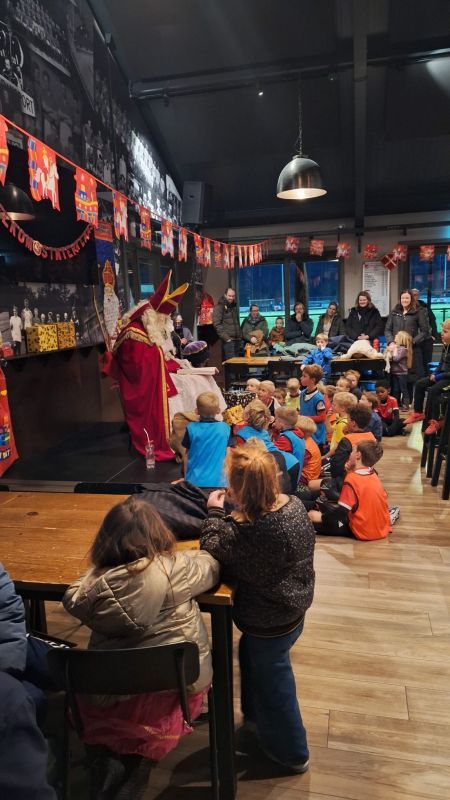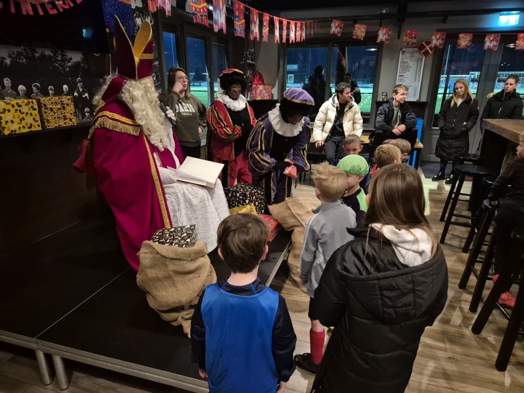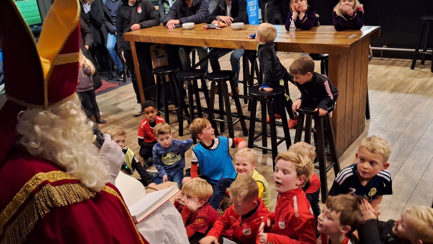 De jongste leden kabouters en JO7 mochten als eerste. Sint wist over ieder kind wel iets te vertellen — en iedereen stak natuurlijk zijn vinger op bij vragen als wie het meest scoort, wie al tanden wisselt en wie een zwemdiploma heeft. Ook kondigde de Sint plechtig aan dat ze echt eens moeten beginnen met échte wedstrijdjes. De kinderen knikten braaf en deden volop mee. De ouders begonnen licht te zweten.