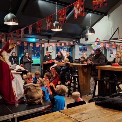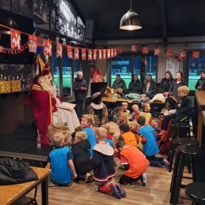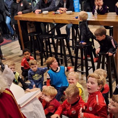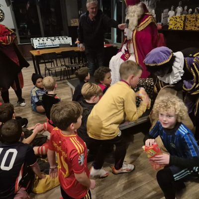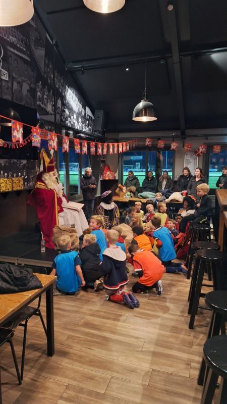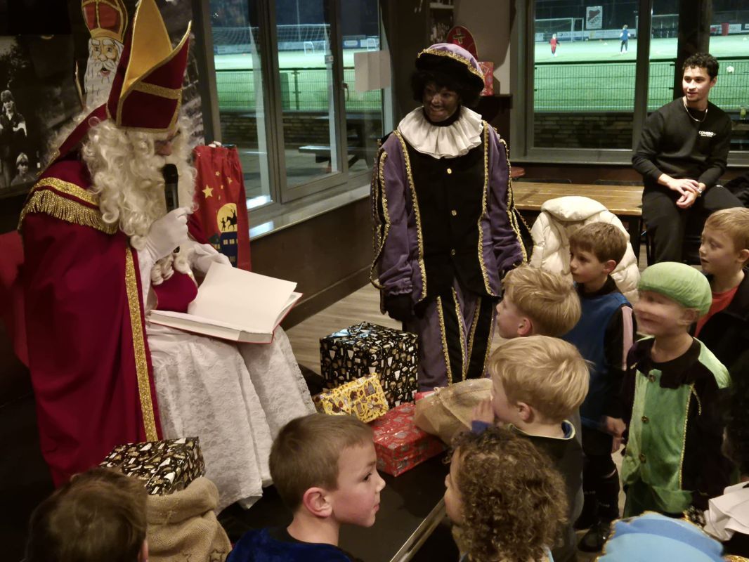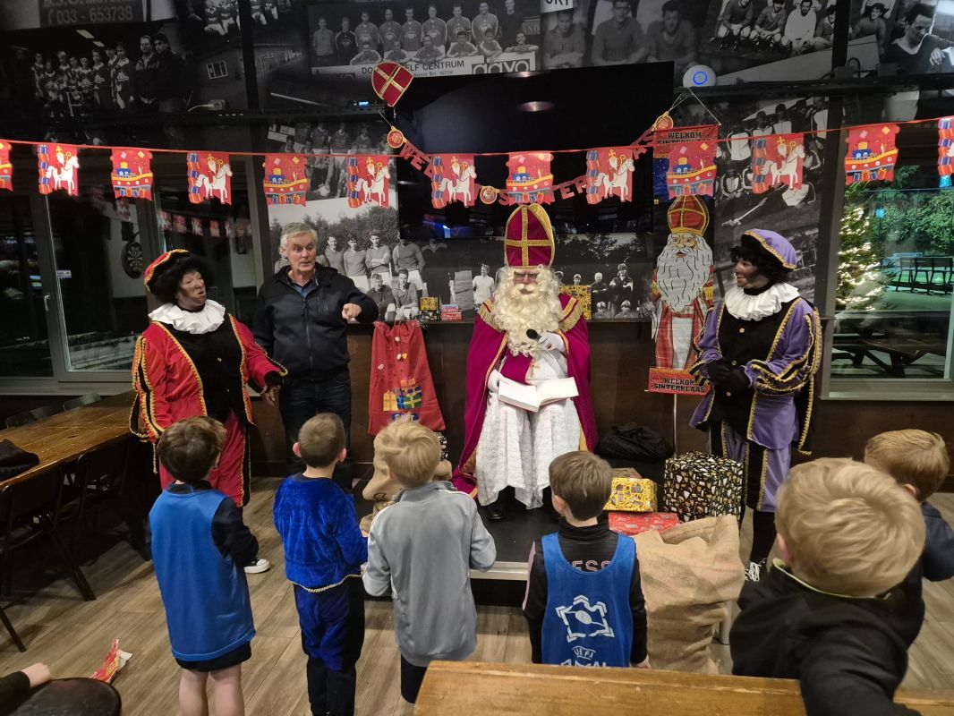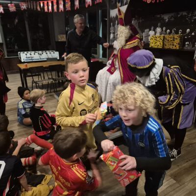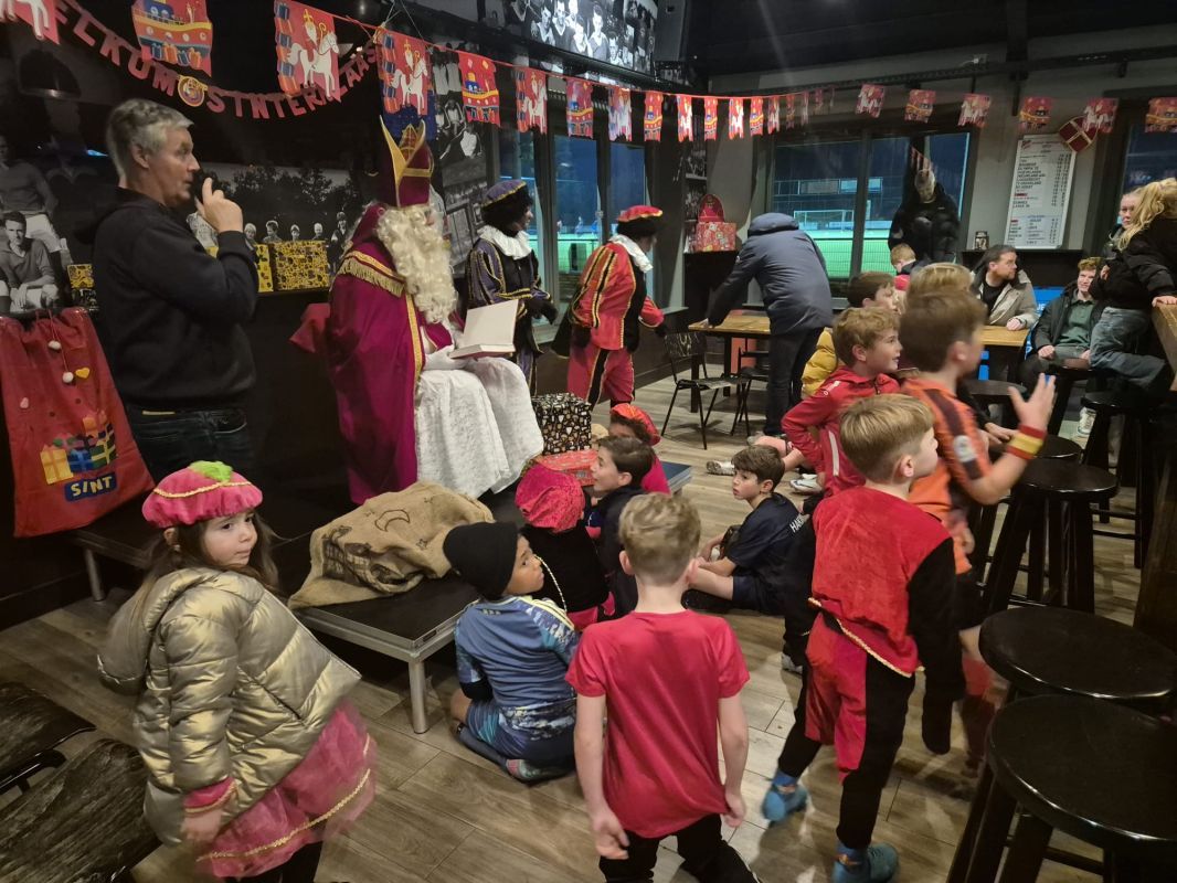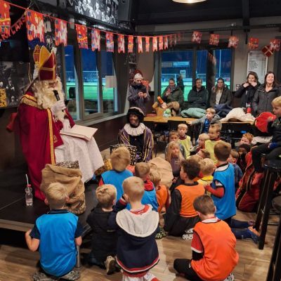 De jongste leden kabouters en JO7 mochten als eerste. Sint wist over ieder kind wel iets te vertellen — en iedereen stak natuurlijk zijn vinger op bij vragen als wie het meest scoort, wie al tanden wisselt en wie een zwemdiploma heeft. Ook kondigde de Sint plechtig aan dat ze echt eens moeten beginnen met échte wedstrijdjes. De kinderen knikten braaf en deden volop mee. De ouders begonnen licht te zweten.