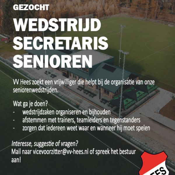 VV Hees zoekt een wedstrijdsecretaris voor seniorenwedstrijden VV Hees is een actieve en gezellige voetbalvereniging. Om de organisatie van onze... Lees verder