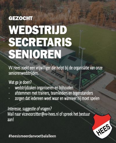 VV Hees is een actieve en gezellige voetbalvereniging. Om de organisatie van onze wedstrijden goed te laten verlopen, zijn we per direct (uiterlijk 1 mei a.s.) op zoek naar een wedstrijdsecretaris die zorgt voor de administratieve en communicatieve afhandeling rondom onze seniorenwedstrijden.